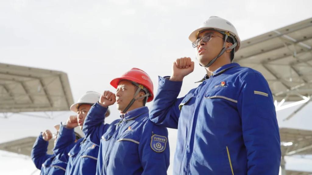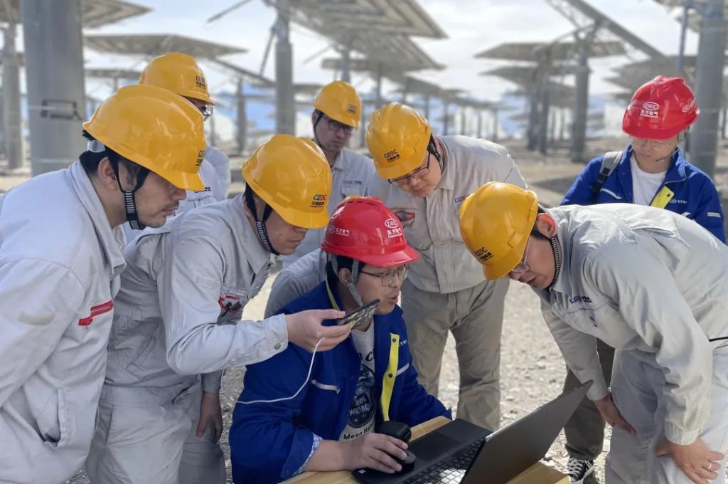 在熔盐上塔的关键节点,首次开发的塔式光热“吸热器”就遇到行业难题。“吸热器”是光热发电的“心脏”,事关整个项目成败。为准时准点完成这次高难度的“手术”,在滴水成冰的季节,在200米的高空,顶着零下27度的严寒,27位人生就是搏人扛起设备下工地,手动调设备。由于作业空间狭小,更是有团队成员一马当先,脱去棉服、身着单衣调试设备。最终,团队以连续21个昼夜的奋战保障项目顺利推进。团队成员中,有的新婚燕尔,有的初为人父,有的甚至在病倒后,醒来后第一句话竟是“设备参数过了吗”……