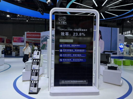 东方光能光伏组件系列产品,适用于分布式、地面电站、海上光伏等多应用场景,本次参展的DEC自主品牌TOPCon 210N-66版型半片双玻光伏组件,采用N型TOPCon电池技术,发电功率最高达740瓦,转换效率达到23.8%,电池技术和制造工艺位列行业前列,具有高发电量、低度电成本、高转化效率、高可靠性、优秀的抗衰减能力、综合发电更优等特点。